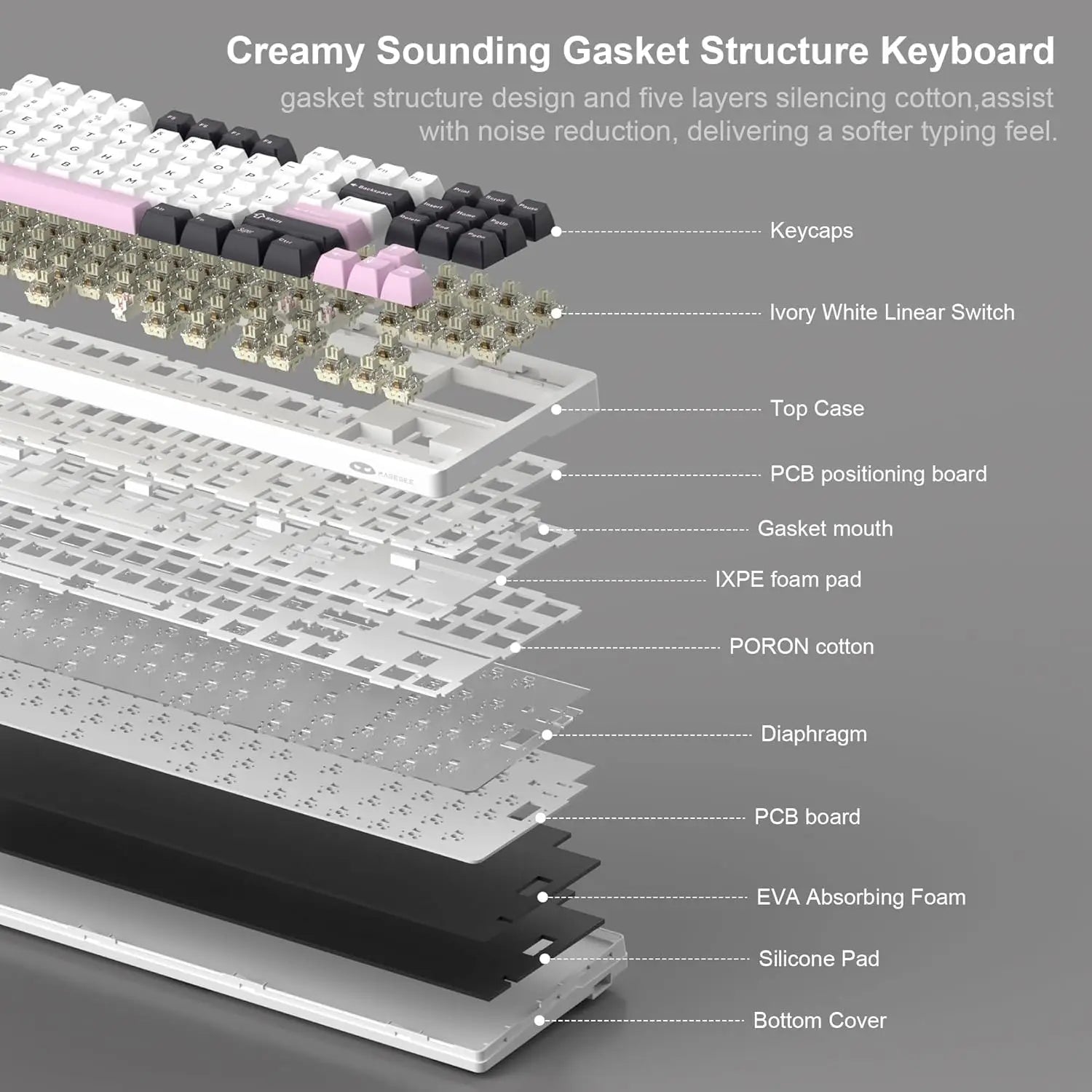 GASKET-MOUNTED STRUCTURE: Unlike the traditional screw fixed structure, the positioning plate of the LIGHT87 creamy keyboard is fixed in the middle by the pressure of the upper and lower shells. There are gaskets distributed around the positioning plate to prevent direct contact between the interior and the shells, acting as a cushioning layer and effectively reducing vibration and noise generated when typing. This keyboard feels soft and even, elastic and has pure sound.