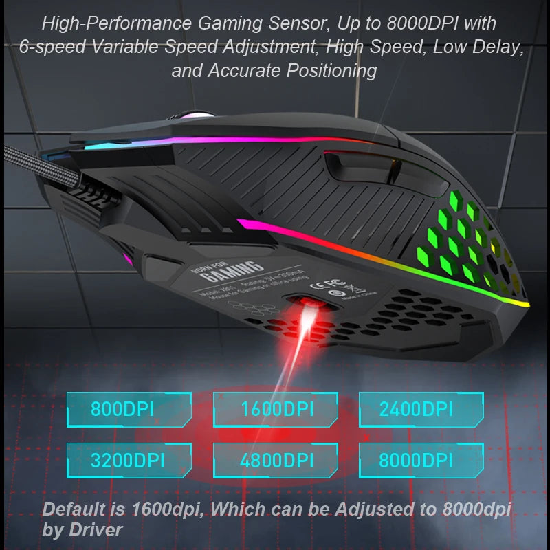 The mice adopts a high-precision optical gaming sensor, you can easily adjust 6 level DPI (800/ 1600/ 2400/ 3200/ 4800/ 8000DPI) to obtain high precision and reater edge over your competition.